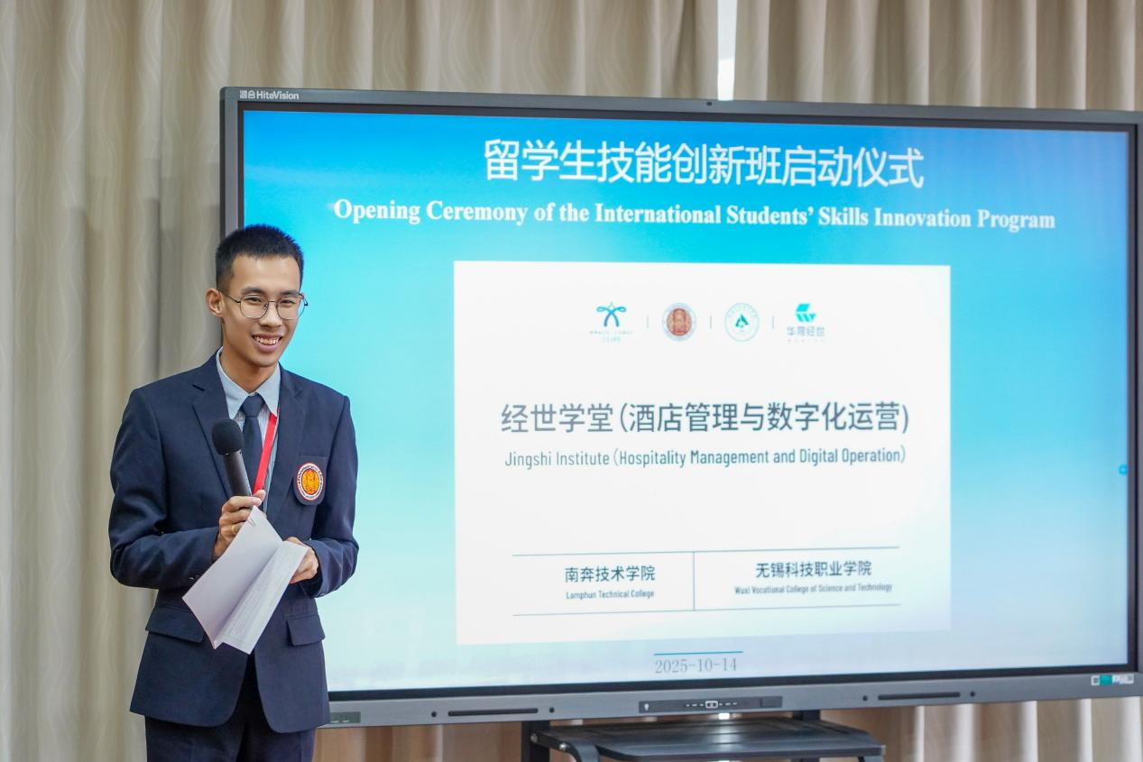 华裕良代表无锡科院向远道而来的泰国师生致以热烈欢迎。他在致辞中介绍,作为江苏省中国特色高水平高职院校建设单位,学校始终坚持国际化办学战略,积极推动职业教育对外开放。本次“经世学堂”技能创新班的举办,是学校依托酒店管理与数字化运营专业优势,在“产教融合、校企合作”专业特色基础之上,拓展国际人才培养模式的又一重要实践。他勉励泰国学子珍惜此次来华学习机会,积极融入校园生活,努力提升专业技能与跨文化交流能力,成为中泰友谊的见证者与传承者。