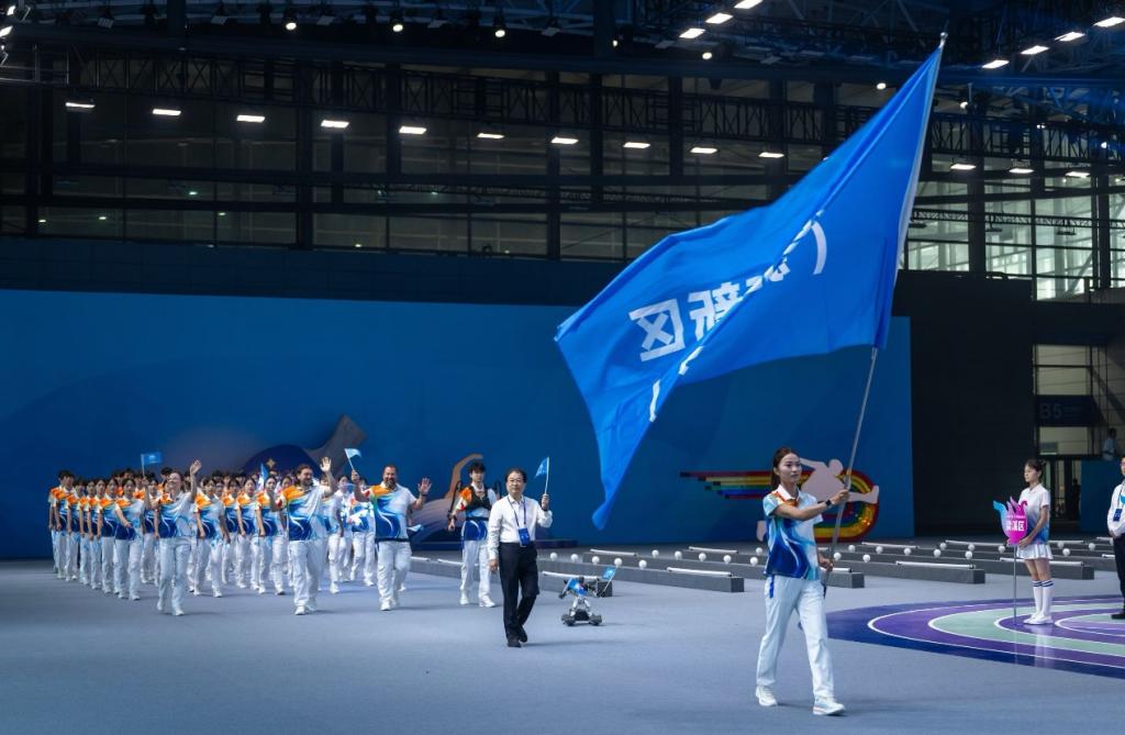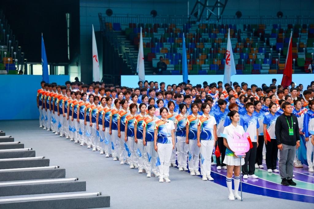 10月15日14时许,入场式正式拉开帷幕。激昂的《五环旗下》入场曲响彻全场,新吴区(无锡科技职业学院)代表队方队身着蓝白相间运动服入场,蓝色呼应新吴区 “创新智造” 的区域底色,白色彰显大学生纯粹向上的精神品格;手中挥舞的蓝色区旗,印着醒目的新区标志。他们迈着铿锵有力的步伐向主席台行进,全程抬头挺胸、精神抖擞,每一步都精准踩在节拍上,尽显青春朝气。当方队行至主席台正前方,“科创高新,活力新吴!”的嘹亮口号骤然响起,声浪激荡博览中心上空,全场爆发出阵阵热烈掌声。