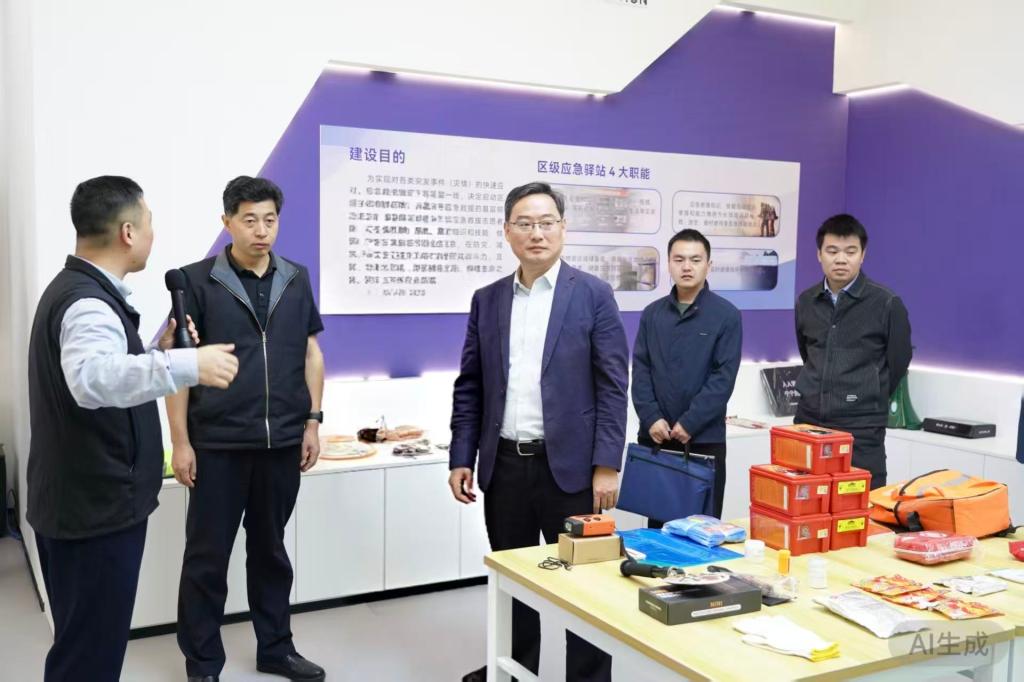 在应急驿站,王刚处长一行察看了应急装备展示并听取了相关介绍。