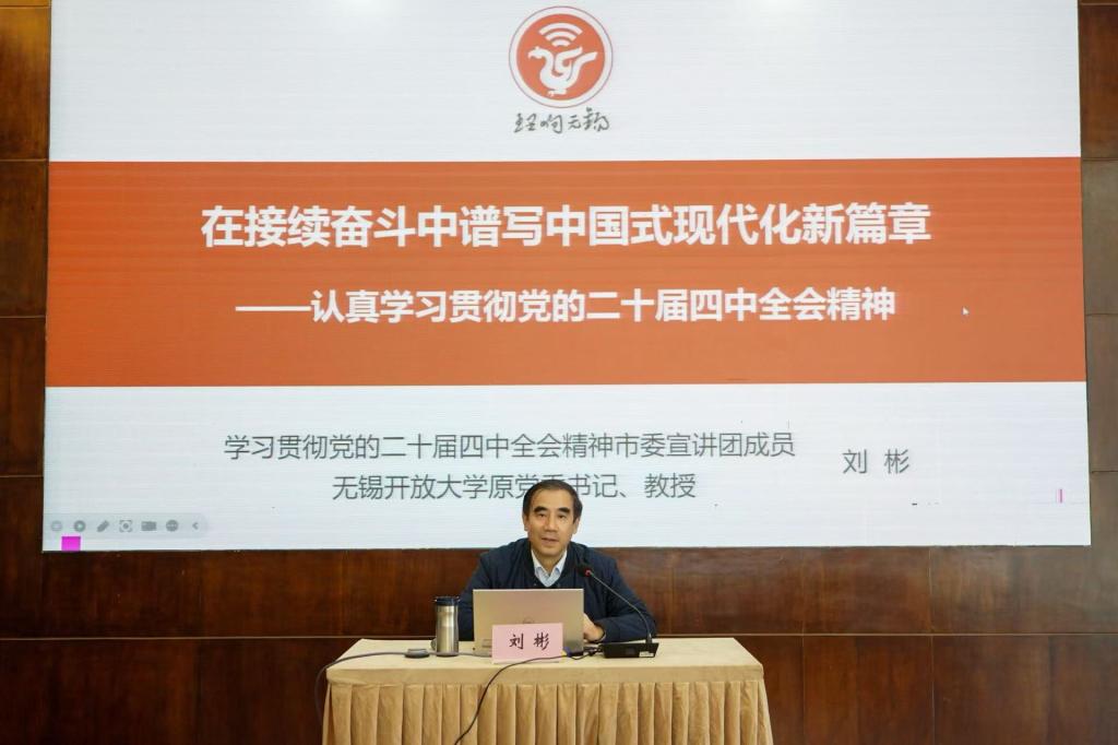 根据市委统一部署,11月26日下午,学习贯彻党的二十届四中全会精神市委宣讲团宣讲报告会在我校举行。市委宣讲团成员、无锡开放大学刘彬教授作宣讲报告。校党委理论学习中心组全体成员参加会议。校党委副书记韩宁主持报告会。