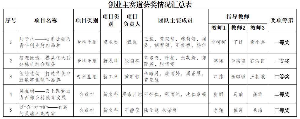 此外,我校其它获奖项目涵盖新工科、新农科、新文科、文化创意、公益服务等多个领域,充分展现了学校创新创业教育的多元培养成效。学校将继续以各类创新创业赛事为抓手,持续优化创新创业生态,培育更多高素质技术技能人才。