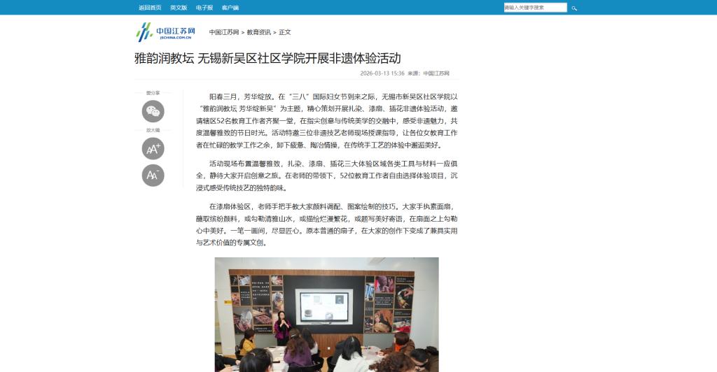 上一篇:新华报业网:雅韵润教坛 无锡新吴区社区学院开展非遗体验活动