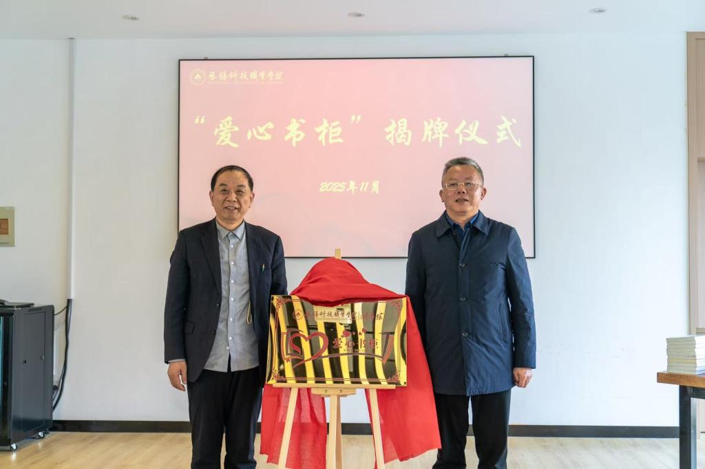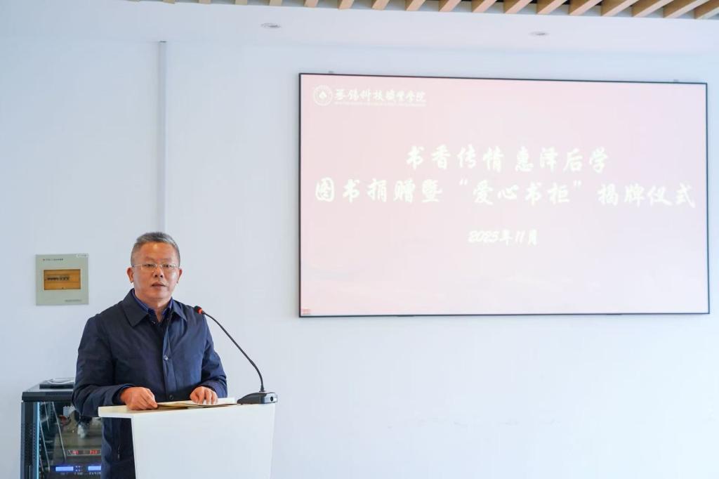 11月21日下午,“书香传情、惠泽后学”图书捐赠暨“爱心书柜”揭牌仪式在学校图书馆文化展示中心举行。无锡高新区党工委原副书记、无锡国家高新区发展研究院院长黄胜平向我校捐赠了1680册图书,其中包含个人不同领域专著近50余册,兼具学术价值与收藏价值,这不仅丰富了学校图书馆的馆藏资源,更为校园注入了宝贵的精神力量。